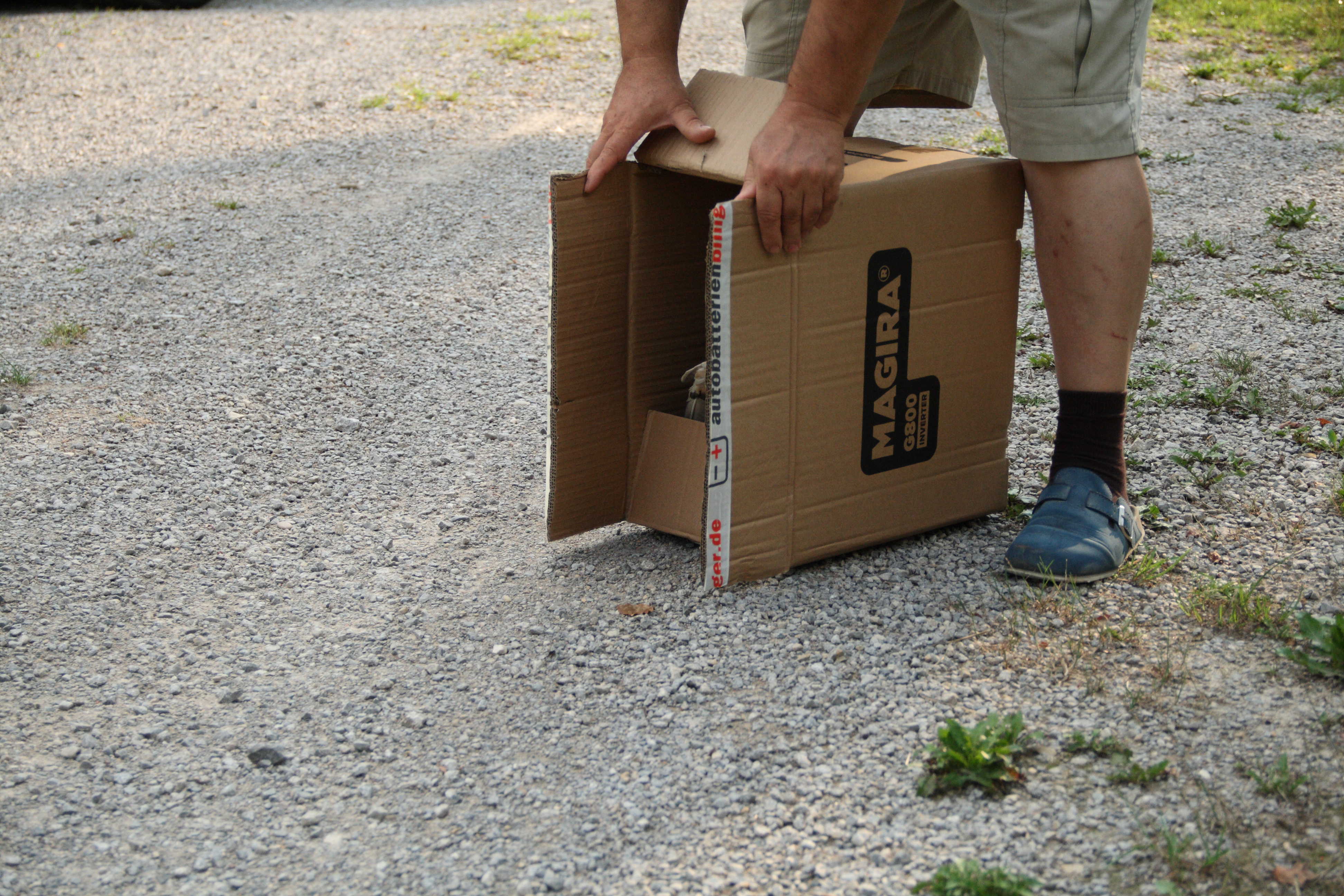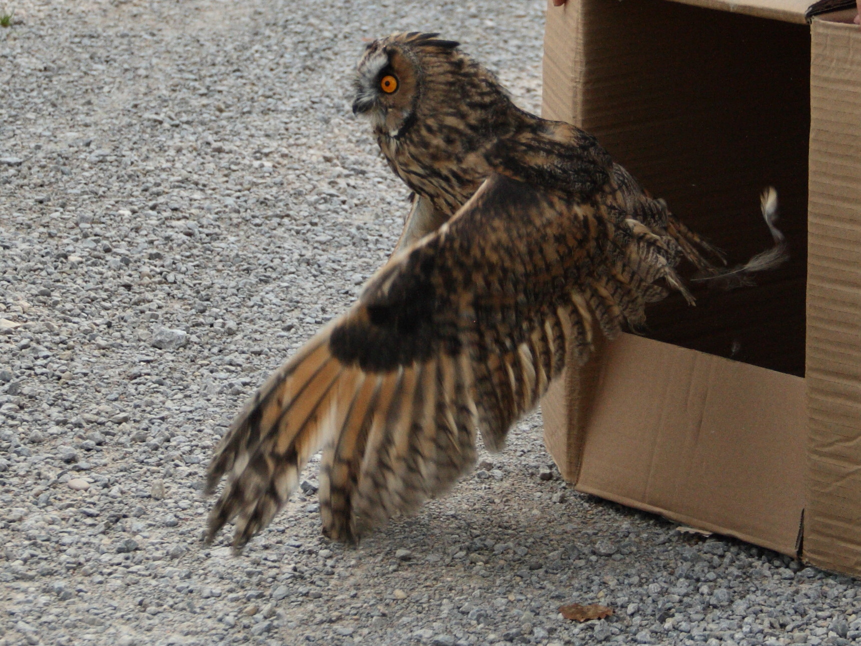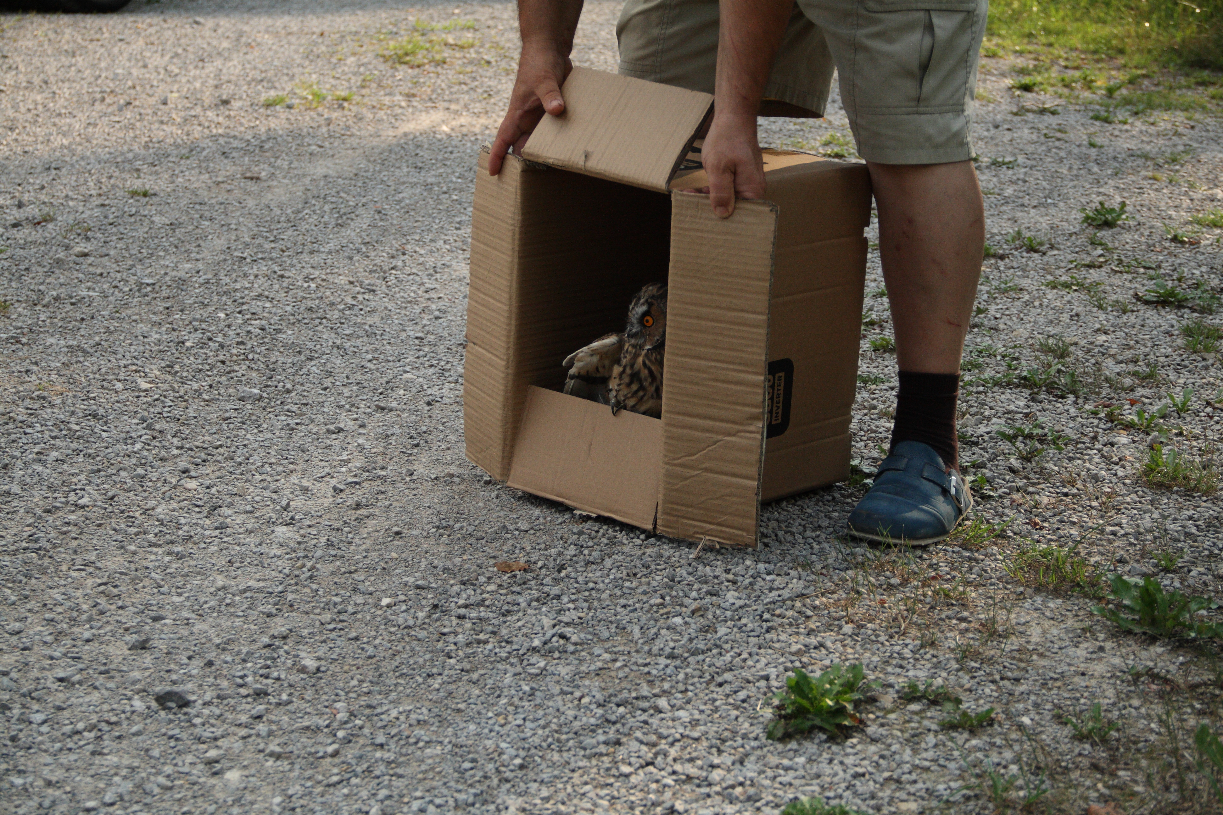In diesem Jahr bekamen wir ein Baby einer Waldohreule (Asio Otus) zur Betreuung gebracht. Das Tier entwickelte sich prächtig und konnte auch schnell wieder in die Freiheit entlassen werden. Am Abend der Auswilderung haben wir den Vogel in einem Pappkarton in ein entlegenes Waldstück gefahren und dort frei gelassen. Unser ehemaliger Patient ist sofort aus der Kiste gestartet.